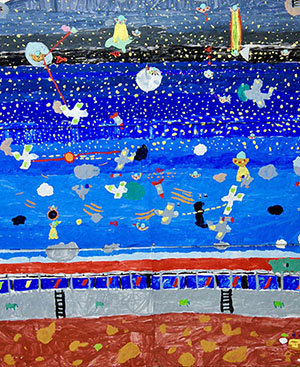 Voici le travail d’un enfant malade, qui vient se détendre à l’Atelier chaque mercredi. Son grand tableau incarne sa rêverie : un espace bleu, infini, sans limites. Une œuvre géante, à la mesure de son imagination.